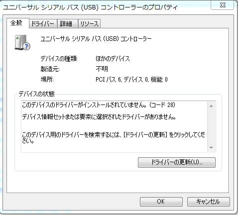 先程の、デバイスマネージャーを開き、問題の項目を見てみると…